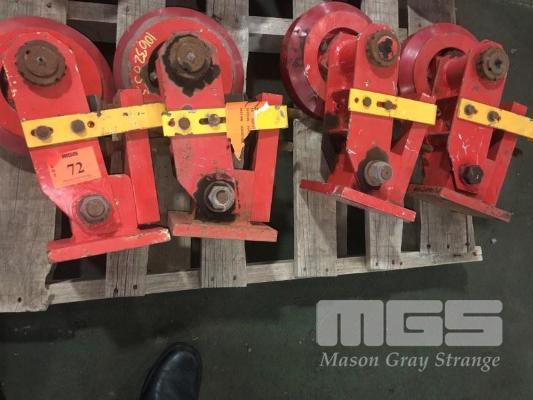 4 x EXTRA HEAVY DUTY CASTORS, RED NYLON WHEELS, 250 x 40mm WITH ADJUSTABLE RUBBER STOPS & SWING ARM ASSEMBLY