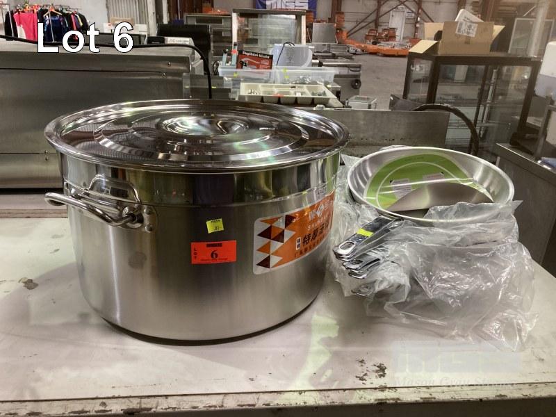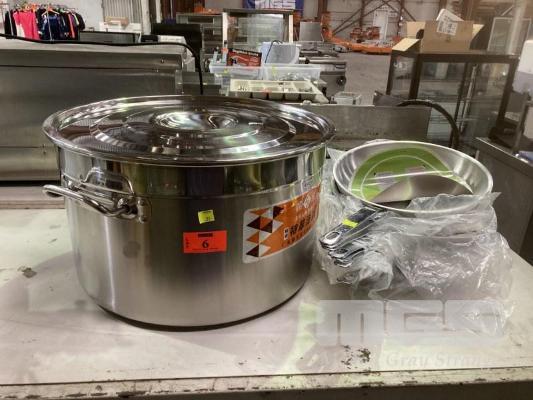 STAINLESS STEEL STOCK POT, 45cm & 7 x FRY PANS