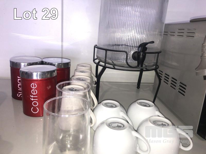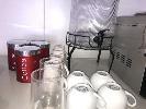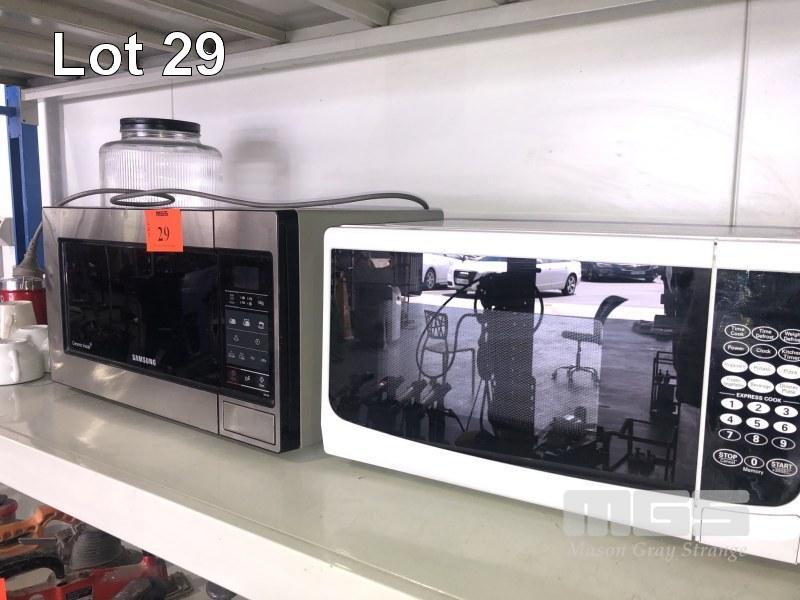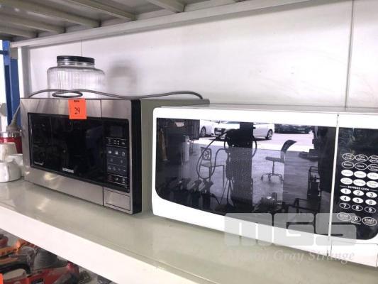 2 x MICROWAVES, SAMSUNG, HOMECO, WITH ASSORTED, CUPS, CONTAINERS, GLASSES, WATER JUG
