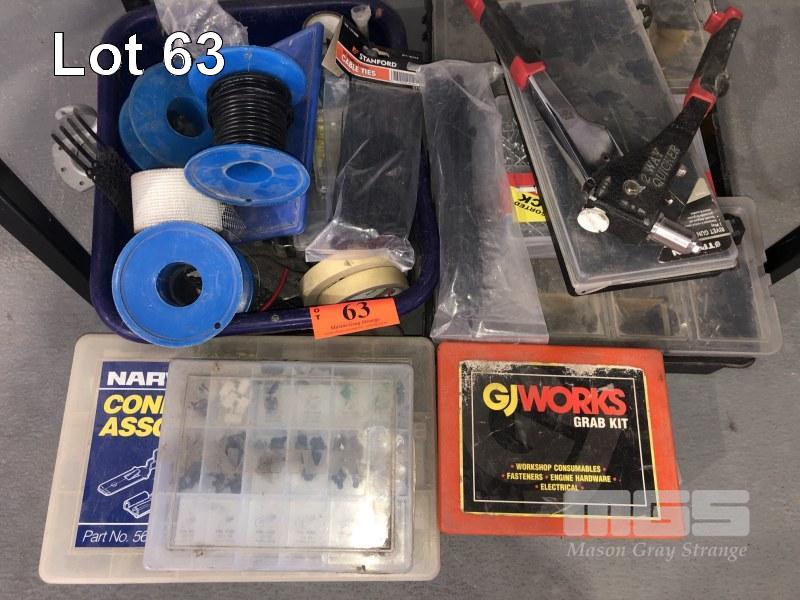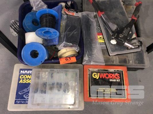 TUB ASSORTED ELECTRICAL HARDWARE, INCLUDING WIRE, FUSES etc WITH GRAB KITS COMPRISING O-RINGS, CIR CLIPS, VARIOUS ELECTRICAL COMPONENTS etc. WITH RIVETS & RIVET GUN