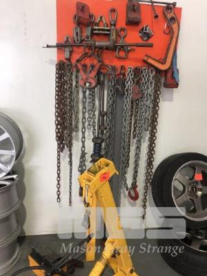 KOREK FLOOR MOUNTED CHASSIS RACK, WITH AIR/HYDRAULIC POWER PACK, ADJUSTABLE HYDRAULIC STRAIGHTENING STAND, WITH ASSORTED CHAIN SETS, GRABS, PULLERS, SLIDE HAMMERS