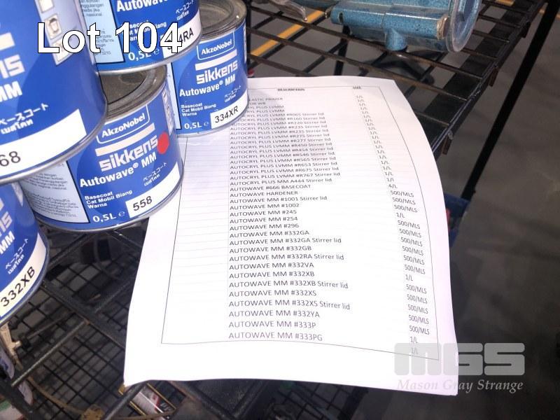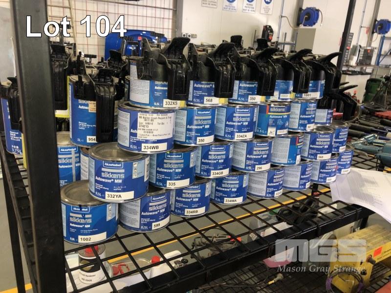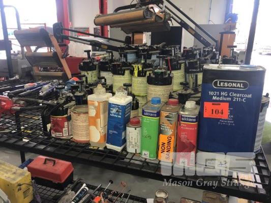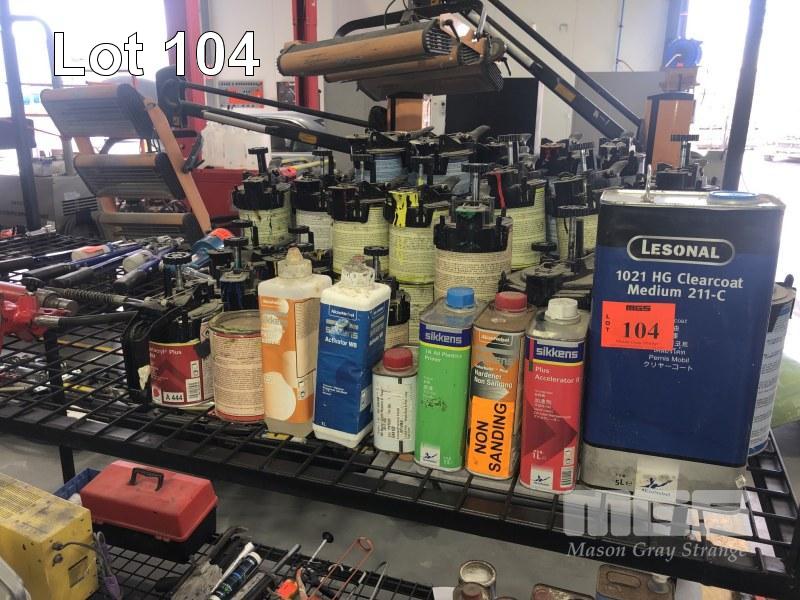 LARGE ASSORTMENT OF AUTOMOTIVE PAINT SUPPLIES INCLUDING PAINTS, CLEAR COATS, PLASTIC PRIMERS, HARDNER, ACCELORATOR etc.