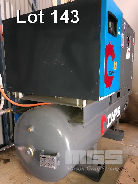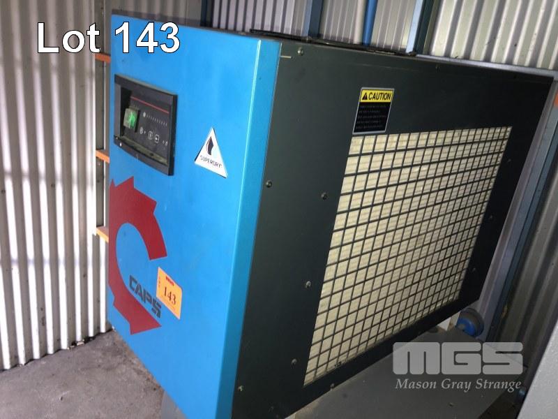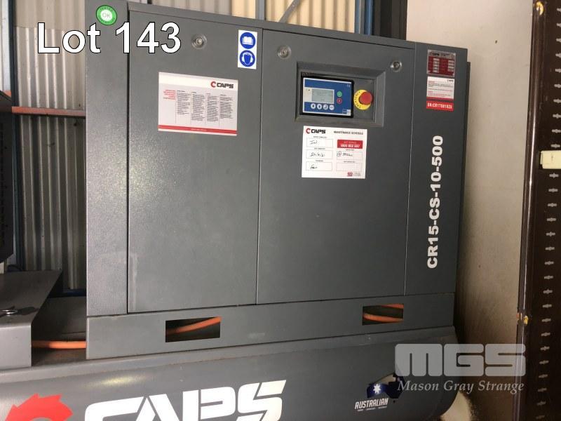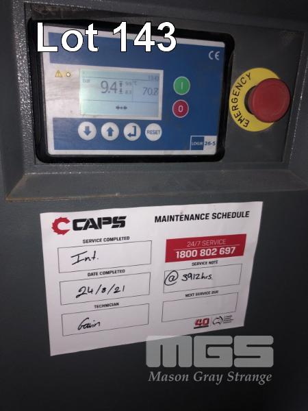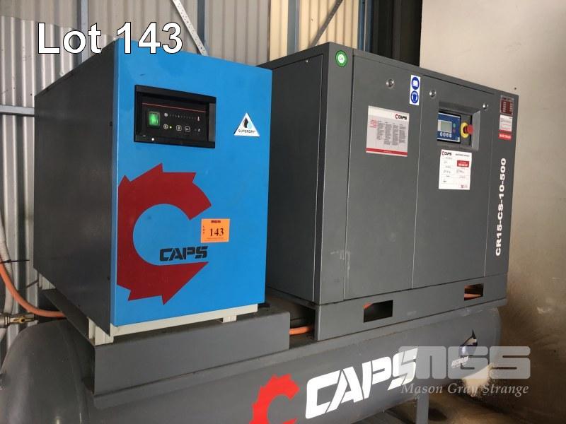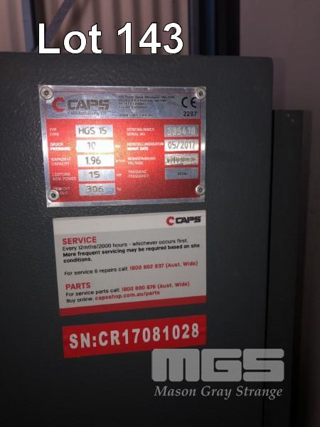 CAPS AUSTRALIA AIR COMPRESSOR, MODEL: HGS15, SERIAL: 205410, DOM: 05/2017, PRESSURE: 10bar, CAP: 1.96m3/min, 15kw, 3 PHASE, 415v, WORKING HOURS: 3,968, LOAD HOURS: 975, 33.2% LOAD, LAST SERVICE: 24/08/2021, WITH CAPS REFRIGERATED DRYER, MODEL: CDRM85-3C, SERIAL: 17DCDRM2479, INCLUDES FILTERS, (DOES NOT INCLUDE AIRLINE)