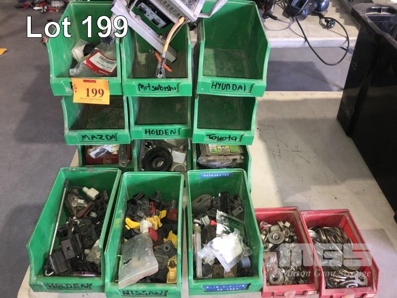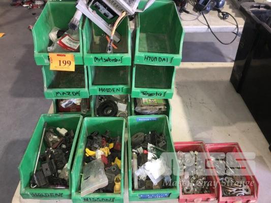 14 x PLASTIC PARTS TUBS & CONTENTS, NUTS, WASHERS, VARIOUS AUTOMOTIVE HARDWARE & LED LIGHT