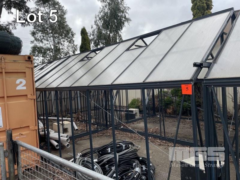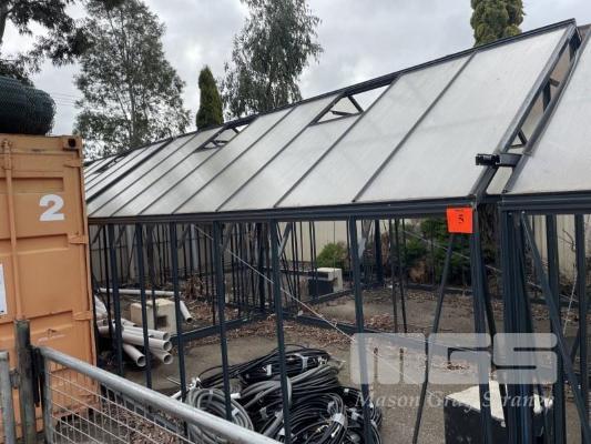 DUAL GLASS HOUSE UNITS, BUILT BY SPROUTWELL, 2017 EXTRUDED ALUMINIUM FRAMES DIMENSIONS, EACH: 3050 x 4870 x 1820 (WALL) x 2900mm GABLE TOP 2 x END SLIDING DOORS, 1040mm OPENING GLASS OUTER WALLS POLYCARBONATE ROOFING WITH LIFT UP ROOF VENTS & DUAL SLIDING DOORS BOTH UNITS HAVE GLASS & DOORS REMOVED ALL ITEMS/GLASS RUBBERS, ETC, ARE IN CRATES FOR TRANSPORT EACH ALUMINIUM FRAME MIGHT REQUIRE DISMANTLING FOR TRANSPORT