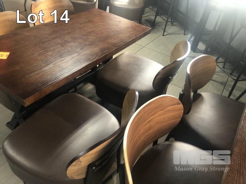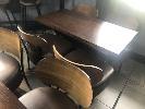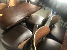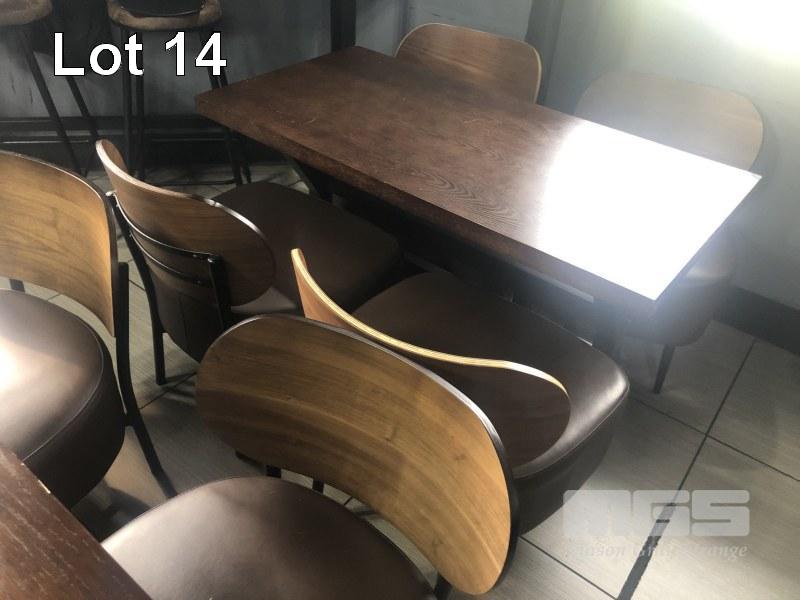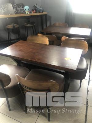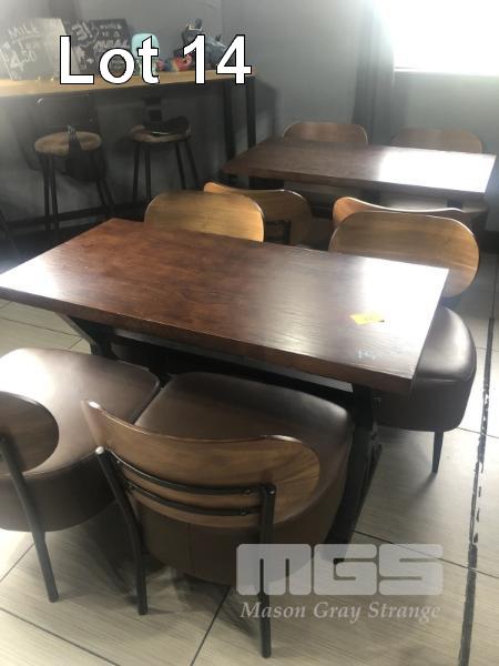 2 x DINING BENCH TABLES, 1200 x 600mm, DARK TIMBER VENEER TOP, BLACK STEEL TWIN PEDESTAL BASE & 4 x CUSTOM DINING CHAIRS, BROWN VINYL BASE, CURVED TIMBER BACK