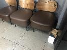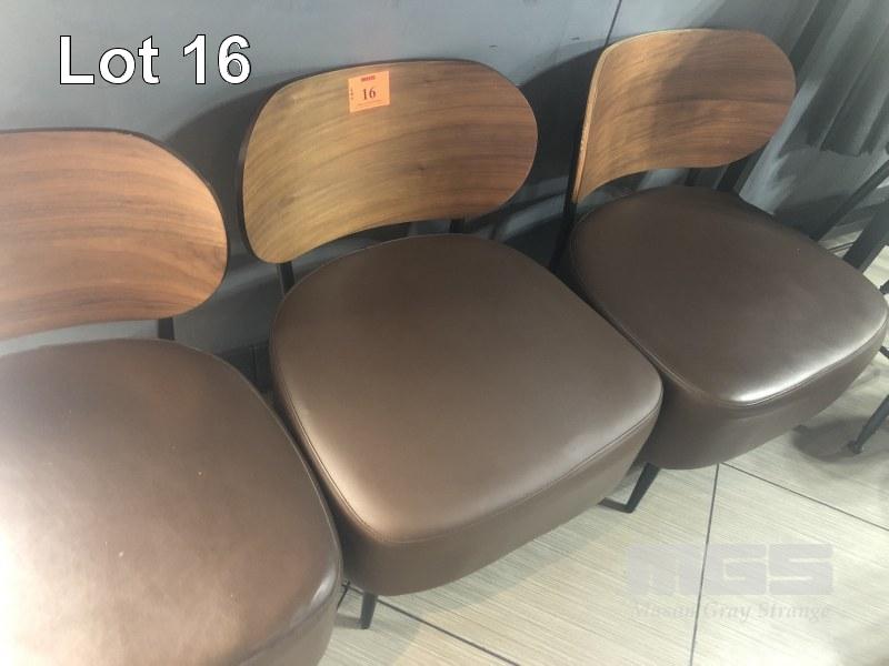 6 x CUSTOM DINING CHAIRS, BROWN VINYL BASE, CURVED TIMBER BACK