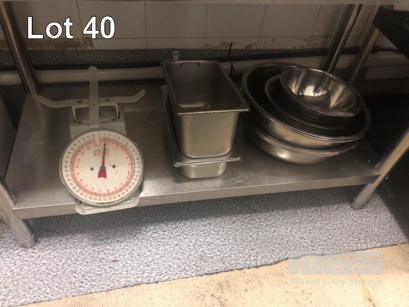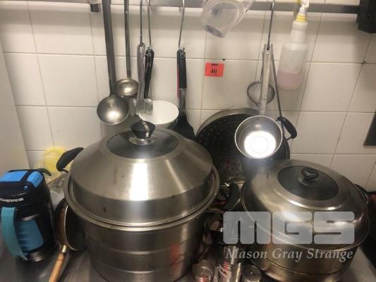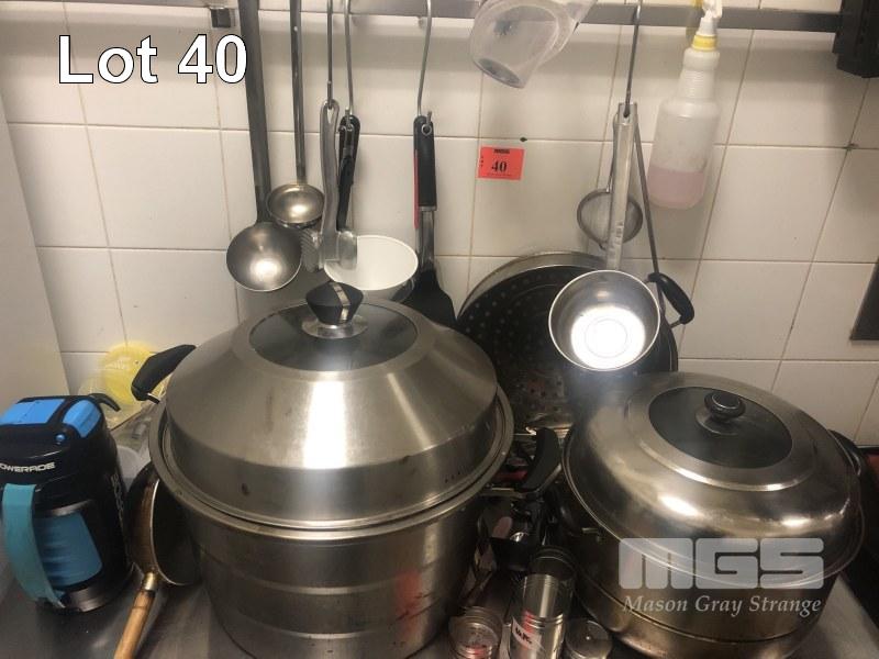 ASSORTED COOKWARE, BUG ZAPPER, STOCK POTS, STAINLESS STEEL COLANDERS, BOWLS, SCALES, UTENSILS, ETC