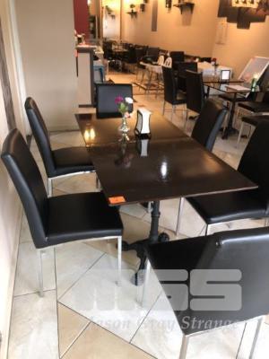2 x DARK FINISH TIMBER TOP TABLES, 800 x 800mm, SINGLE PEDESTAL CAST ORNATE BASES & 6 x BLACK VINYL & CHROME CHAIRS