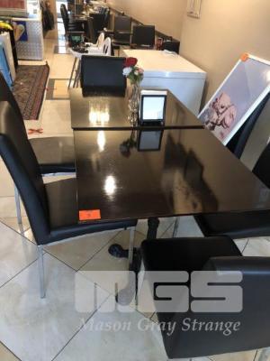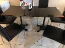 2 x DARK FINISH TIMBER TOP TABLES, 800 x 800mm, SINGLE PEDESTAL CAST ORNATE BASES & 6 x BLACK VINYL & CHROME CHAIRS