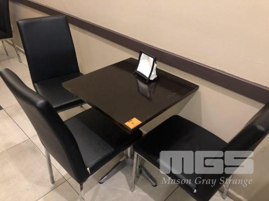 2 x DARK FINISH TIMBER TOP TABLES, 600 x 600mm, SINGLE PEDESTAL ALLOY BASES & 3 x BLACK VINYL & CHROME CHAIRS