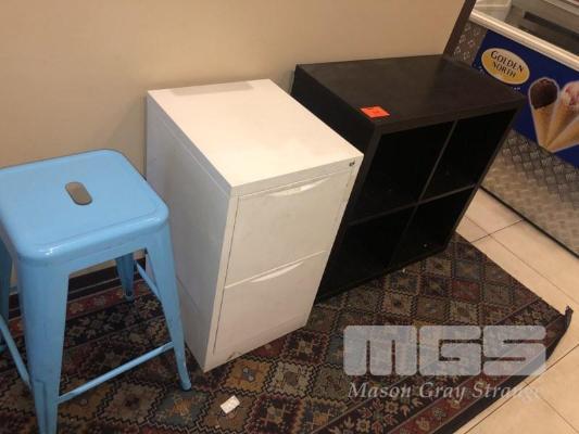 LOWLINE TIMBER SHELF UNIT, 2 TIER, STEEL 2 DRAWER FILING CABINET, BLUE STEEL STOOL & 2 x FLOOR RUGS