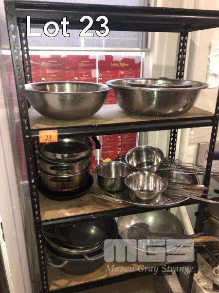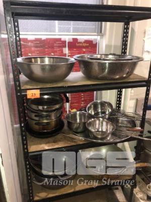 5 TIER RACK & STAINLESS STEEL COOKWARE, LARGE & SMALL POTS, SIEVES, TRAY & FRY PANS (APPROX 20 PIECES)