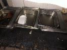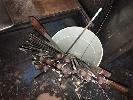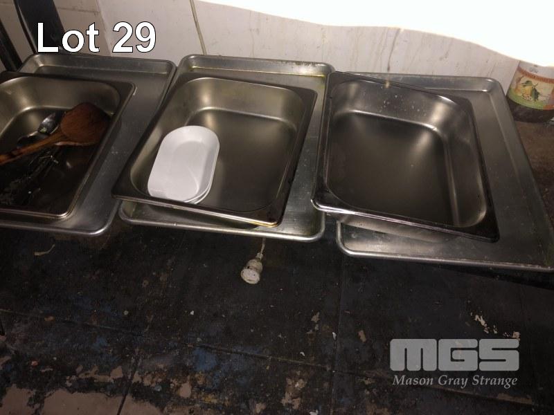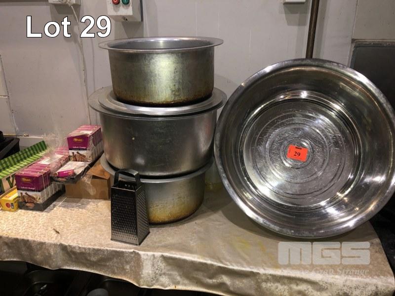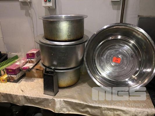 RACK & CONTENTS, 2 TIER, ALUMINIUM STOCK POTS, LARGE STAINLESS STEEL POT, ASSORTED STAINLESS STEEL & ALLOY TRAYS & STAINLESS STEEL MEAT SKEWERS