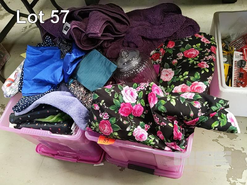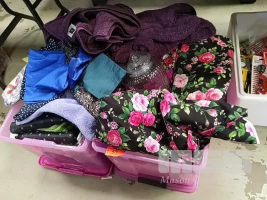 ASSORTED MATERIAL, TOWELS, GLASS JARS, ETC.