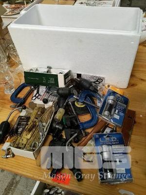 ASSORTED HAND TOLLS, TAP FITTINGS, ETC.