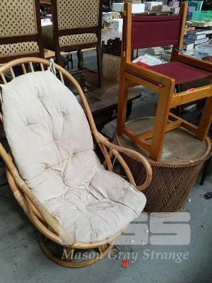 CANE SWIVEL ARM CHAIR, WICKER COFFEE TABLE & 2 x TIMBER DINING CHAIRS
