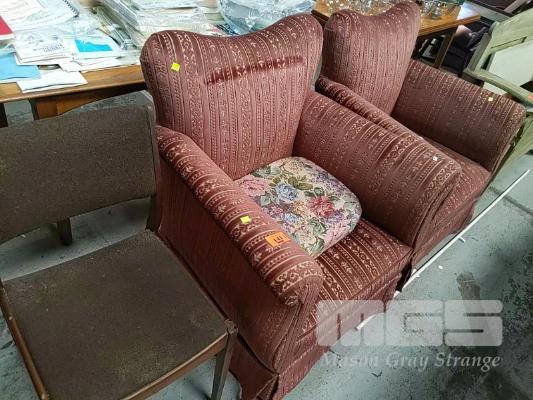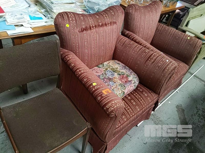 PAIR ARM CHAIRS, ROLL ARM, PINK PATTERN FABRIC