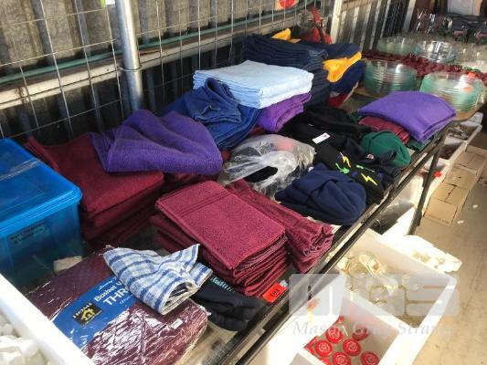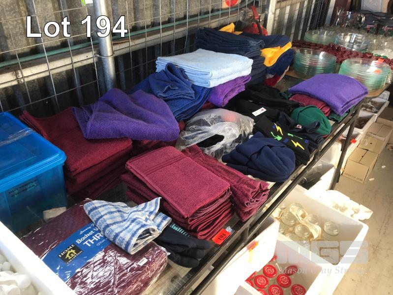 ASSORTED BATHROOM TOWELS, HAND TOWELS, SOCKS & BEANIES (1 X TABLE)