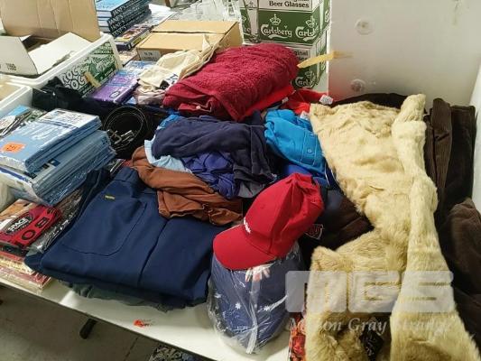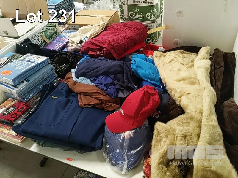 ASSORTED MENS CLOTHING, BEDDING, HATS, ETC.
