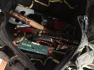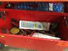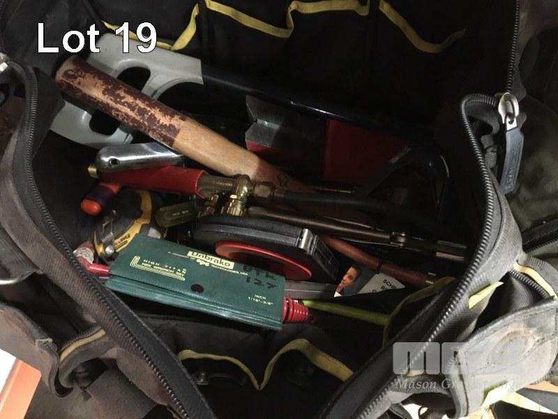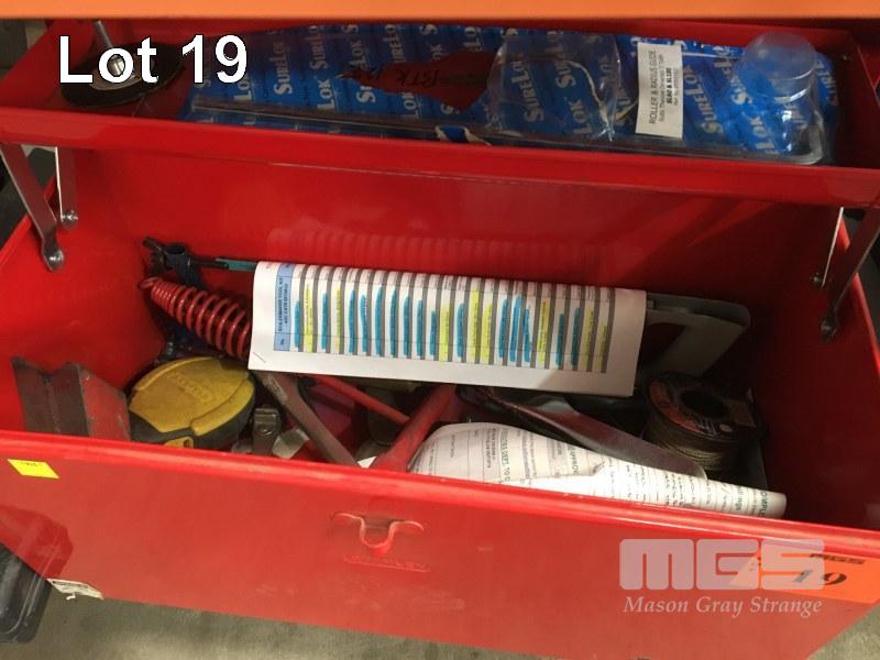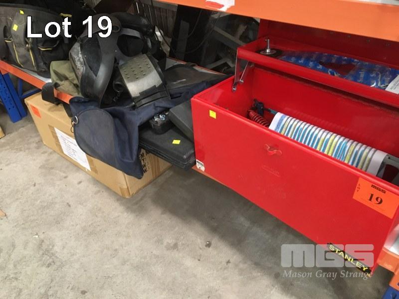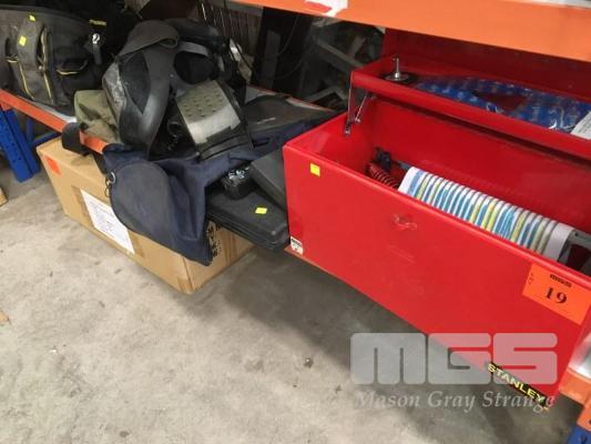 TOOL BOX & ASSORTED HAND TOOLS, AUTO TINT WELDING HELMET, POSITIVE AIR FACE MASK & POWER PACK, M&R COMBINATION SET, TOOL BAG, ETC