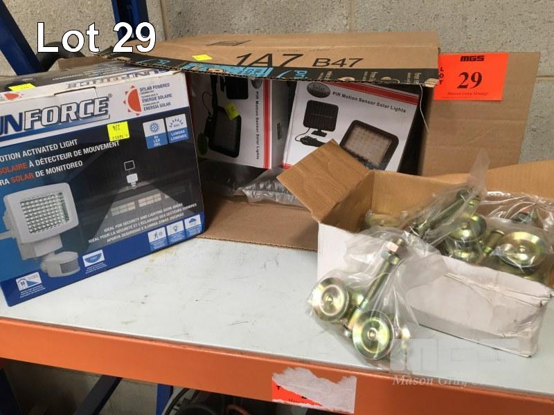 SHED DOOR, 8 x TRACK ROLLER HANGERS, 3 x MOTION SENSOR SOLAR LIGHTS, LED NEW IN BOX