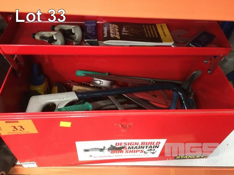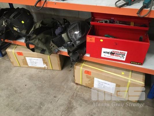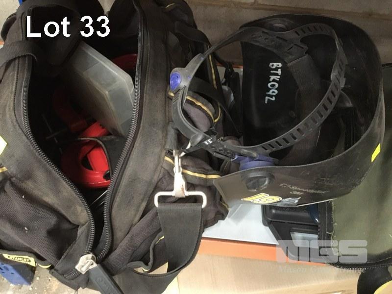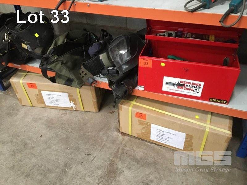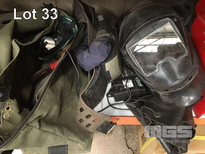 TOOL BOX & ASSORTED HAND TOOLS, WELDING HELMET, POSITIVE AIR FACE MASK, TOOL BAG, DRIVER SET, ETC