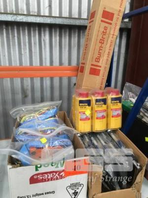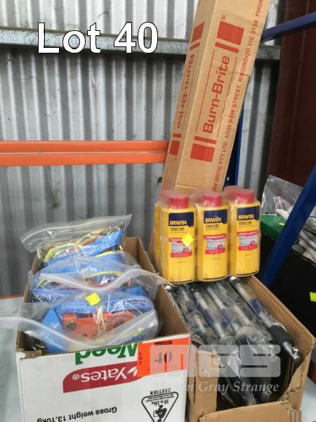 6 x G-CLAMPS, BURN BRITE WORK LIGHT, 8 x RATCHET STRAPS & 6 x IRWIN STRAIGHT LINE MARKING CHALK