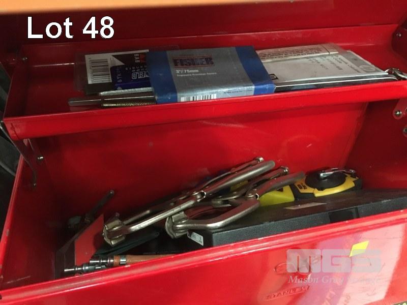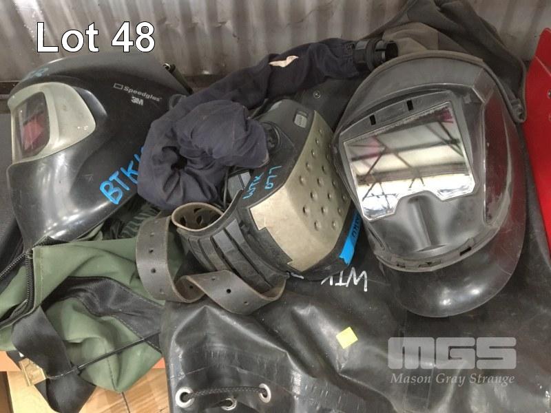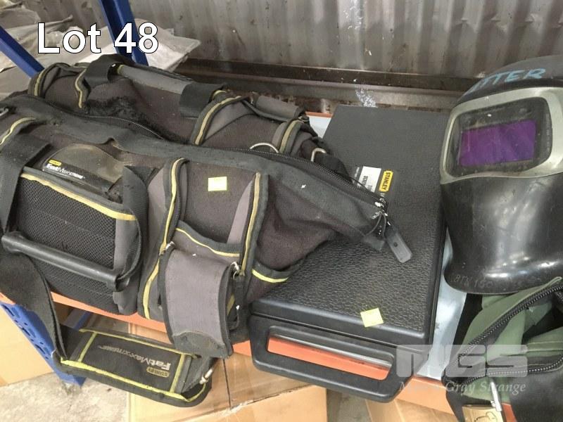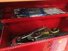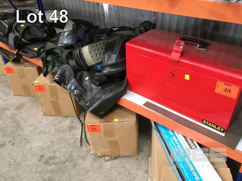 TOOL BOX & ASSORTED HAND TOOLS, WELDING & POSITIVE AIR MASK, TOOL BAG & TOOLS