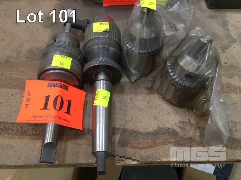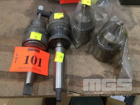 2 x DRILL CHUCKS INC 16mm WITH KEY No 1 M/T & 13mm KEYLESS No 3 M/T WITH 2 x JACOBS CHUCK HEADS, 13mm