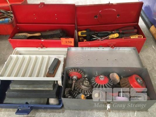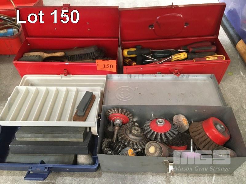 4 x TOOL BOXES & CONTENTS WIRE BRUSHES, SCREWDRIVERS, STONE SHARPENERS, GRINDING WHEELS, ETC