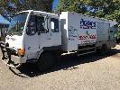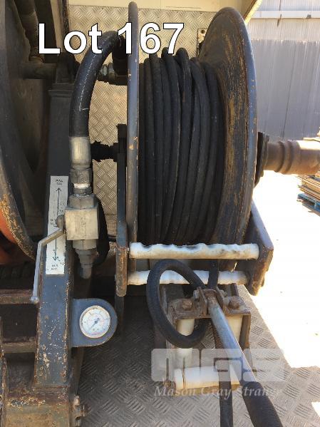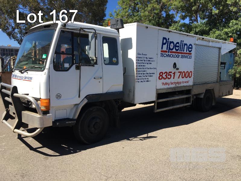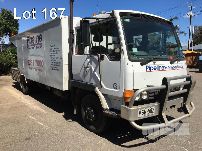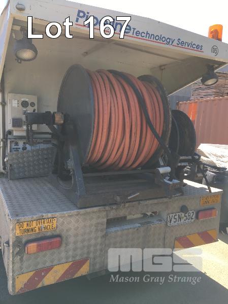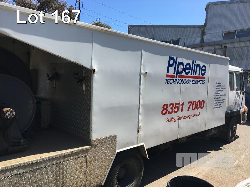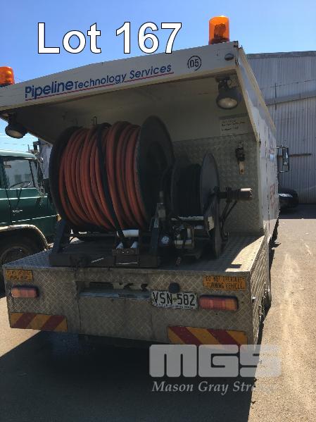 1995 MITSUBISHI FK417KS 4x2 SINGLE CAB OVER, FITTED WITH HIGH PRESSURE PIPE LINE CLEARING SYSTEM REG: VSN 582 (SA) VIN: 6F6K4G23TSB031802 ENG: 794126 ODO: 573,863kms SHOWING GVM: 8,980kg GCM: 16,000kg MITSUBISHI 6D16, 6 CYLINDER, 6 SPEED MANUAL TRANSMISSION, TURBO DIESEL, SPRING SUSPENSION, WHITE DUCO, 2 DOORS, 3 SEAT, FITTED WITH MYERS HIGH PRESSURE PUMP MOD: D65-20 PTO DRIVEN WITH FIBREGLASS TANK, APPROX 2,000 LITRE CAPACITY, MOUNTED IN ENCLOSED BODY, INCLUDING ASSORTED MULTI DIRECTIONAL WATER JET ATTACHMENTS, CUTTERS, FLAIL, HOSES & FITTINGS, 2 x REAR MOUNT HOSE REELS, HYDRAULIC DRIVEN WITH REMOTE PENDANT CONTROL UNDERTRAY TOOL BOXES, ALLOY BULL BAR , DUAL REAR WHEELS, 8.25 R16LT, TYRES IN AVERAGE TO POOR CONDITION KEY #12