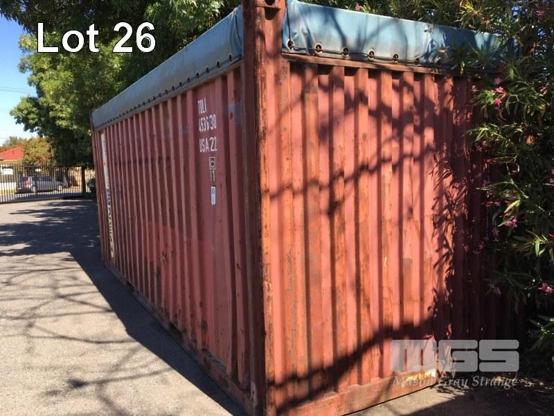 20' SHIPPING CONTAINER, BROWN/RED OPEN TOP WITH STEEL CROSS BEAM ROOF SUPPORTS & CANVAS/PVC TARP COVER (TARP HAS LARGE HOLES & RIPS) CONTAINER HAS SOME RUST HOLES IN DOORS & SOME DEEP SURFACE RUST, TIMBER FLOOR WITH SOME WARPING FROM WATER DAMAGE ID NO: TOLU4536307