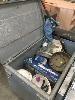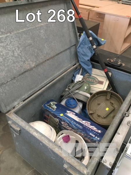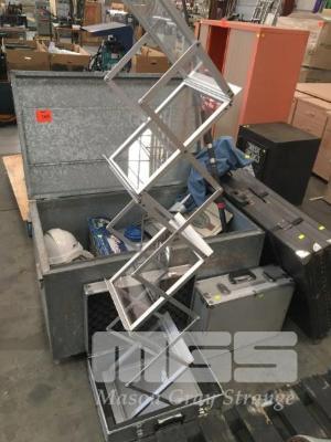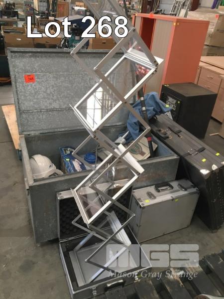GALV STEEL TOOLBOX/SITE BOX, MOBILE 600 x 1000 x 600mm (H), AMMO CAN HARD HATS, FLOOR POLISHER, ELECTROLUX & ASSORTED MODULAR & COLLAPSIBLE POSTER/PAMPHLET STANDS IN CASES