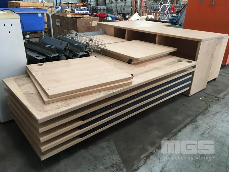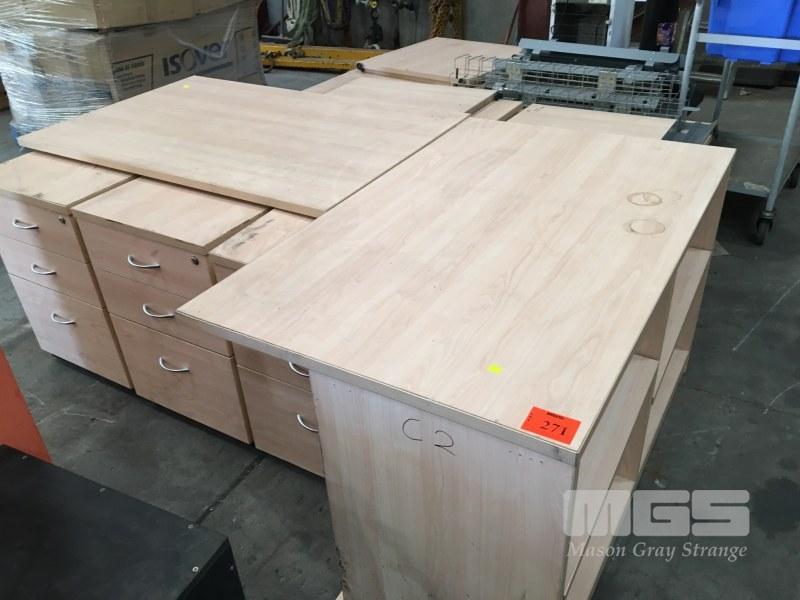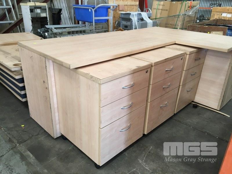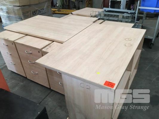 3 x UNDERDESK MOBILES, 2 x LOWLINE SHELF UNITS, 1200 x 730mm (H) & 4 x L-SHAPE DESKS/WORK STATIONS & WATER COOLER DIS-ASSEMBLED WITH PARTITIONS
