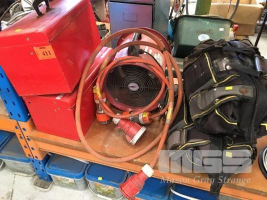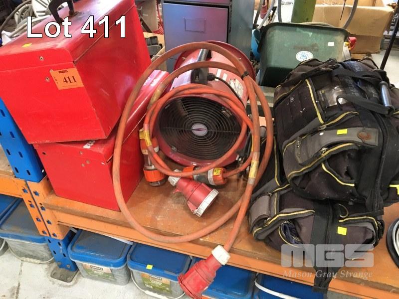 2 x TOOL BOXES & 2 x TOOL BAGS, 2 x 415V EXTENSION LEADS & PORTABLE EXTRACTOR/VENTILATOR FAN UNIT, TRADEMASTER, 240V