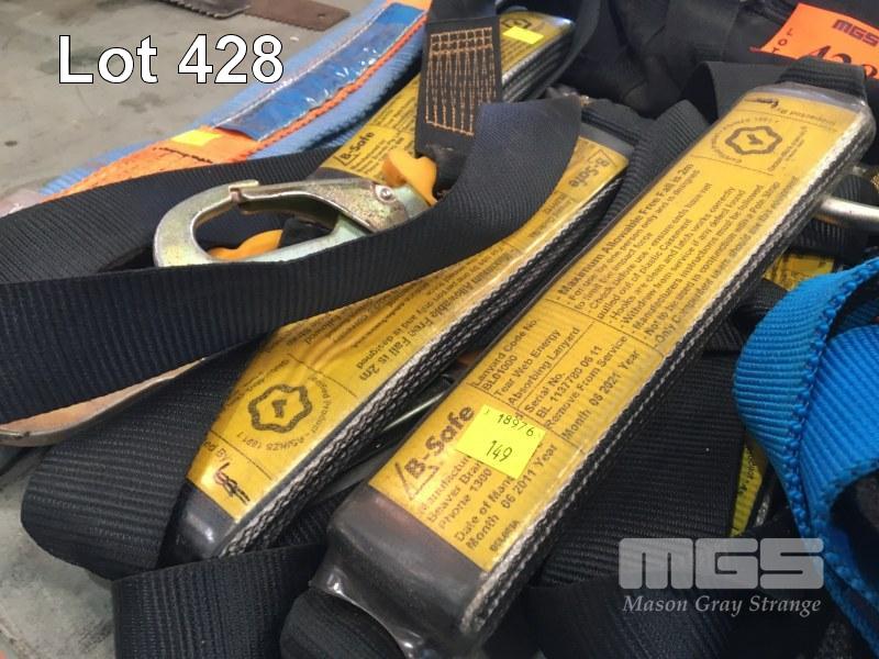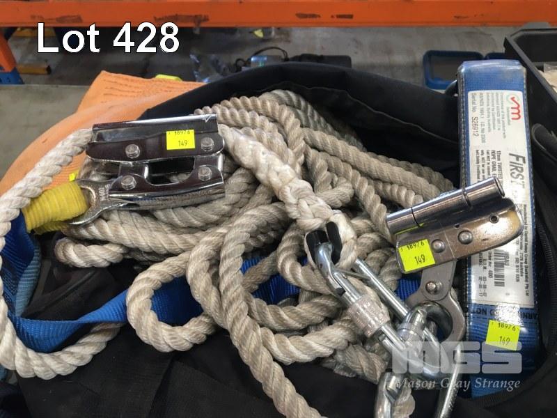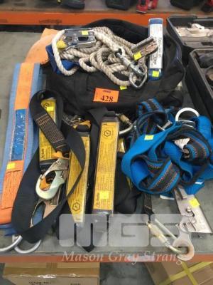 FALL ARREST/CLIMBING EQUIPMENT INC 4 POINT SAFETY HARNESS, 5 x LANYARD SHOCK ABSORBERS, 3 x FALL ARREST/ROPE SELF CLIMBING DEVICES, SPAN SET ATTACHMENT STRAP & SAFETY ROPE