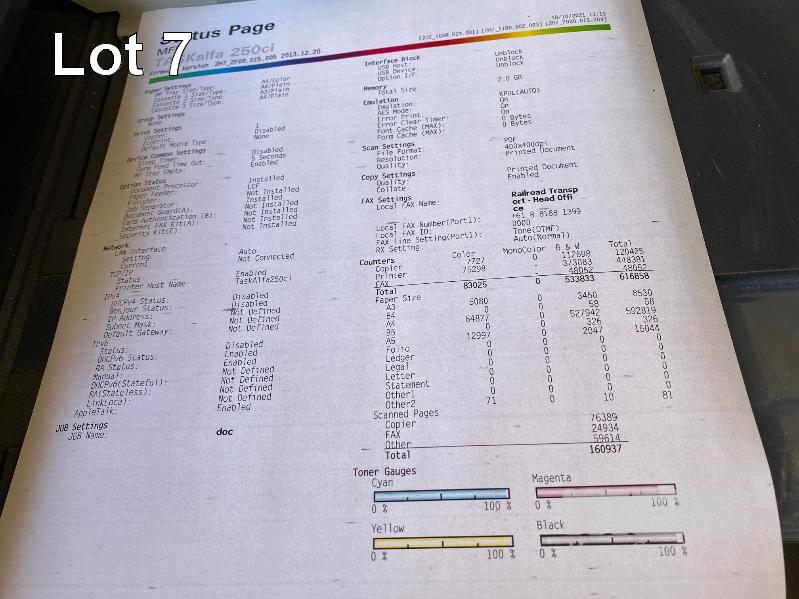 PHOTOCOPIER, KYOCERA TASKalfa 250ci COLOUR, ADF, PRINTER USB & NETWORK PORTS, FAX, 83,025 COLOUR & 533,833 B&W COPIES SHOWING (TEST PAGE ATTACHED - POOR QUALITY)
