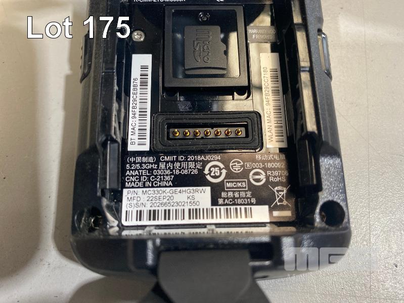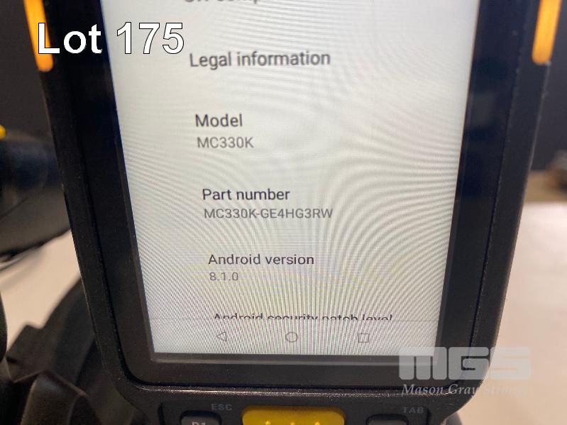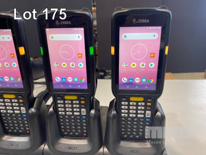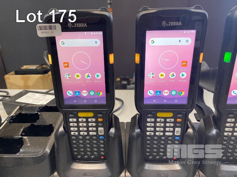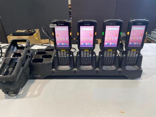 4 x ZEBRA MC330K PREMIUM HANDHELD MOBILE COMPUTERS WITH GUN TRIGGER, ANDROID OS, 2D IMAGER, Wi-Fi, BLUETOOTH, MODEL MC330K-GE4HG3RW (DOM 9/2020) WITH PROTECTIVE RUBBER & ZEBRA CHARGING CRADLE, MODEL CRD-MC33-4SC4BC-01 WITH POWER SUPPLY S/N:S20266523021507, S20256523021018, S20266523021550, S20266523021696