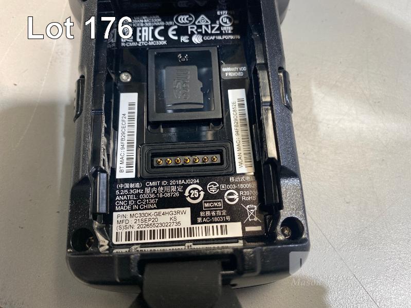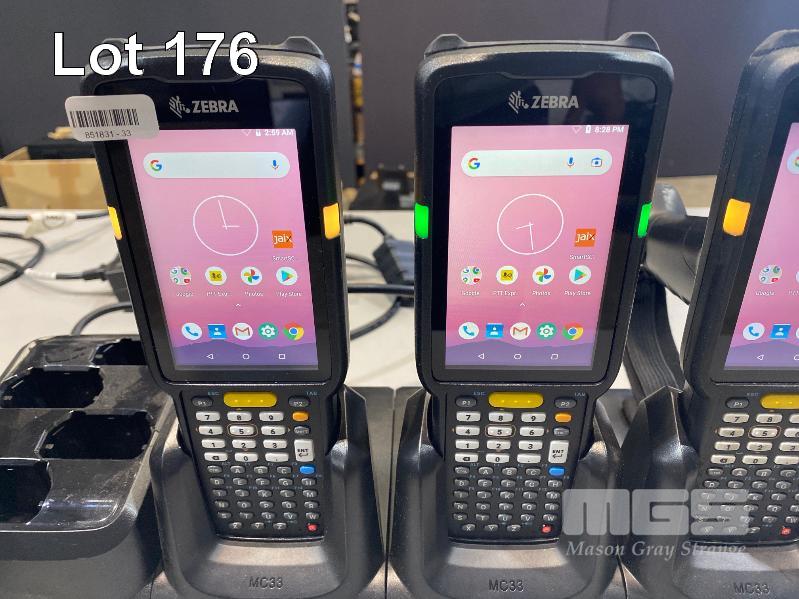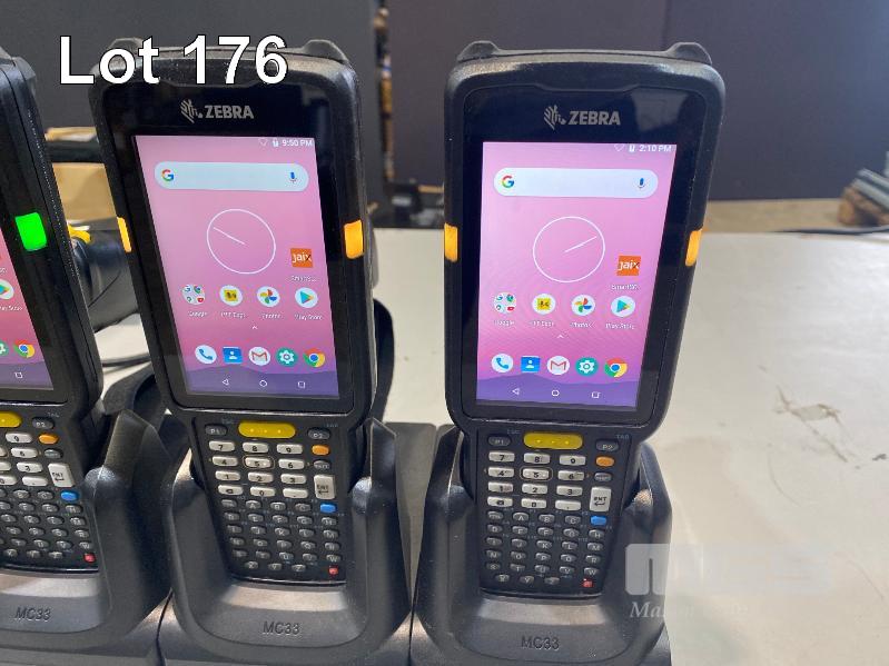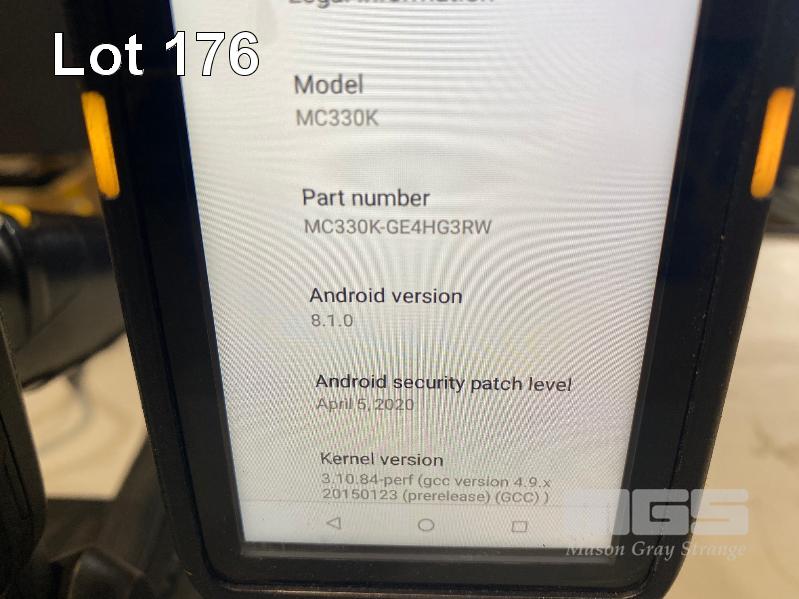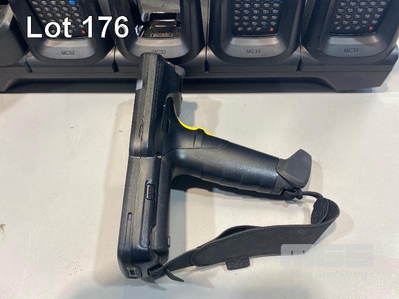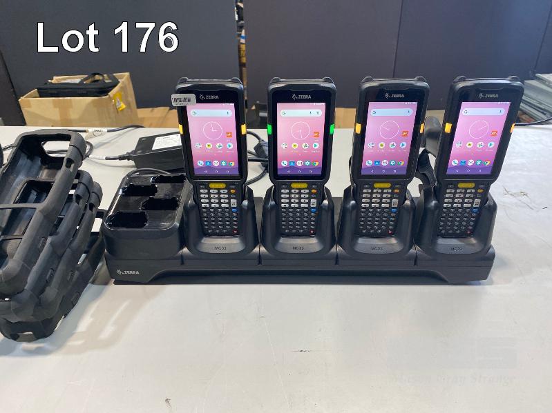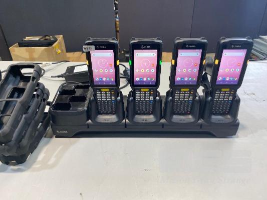 4 x ZEBRA MC330K PREMIUM HANDHELD MOBILE COMPUTERS WITH GUN TRIGGER, ANDROID OS, 2D IMAGER, Wi-Fi, BLUETOOTH, MODEL MC330K-GE4HG3RW (DOM 9/2020) WITH PROTECTIVE RUBBER & ZEBRA CHARGING CRADLE, MODEL CRD-MC33-4SC4BC-01 WITH POWER SUPPLY S/N:S20268523021648, S20265523022735, S20265523022680, S20268523021749