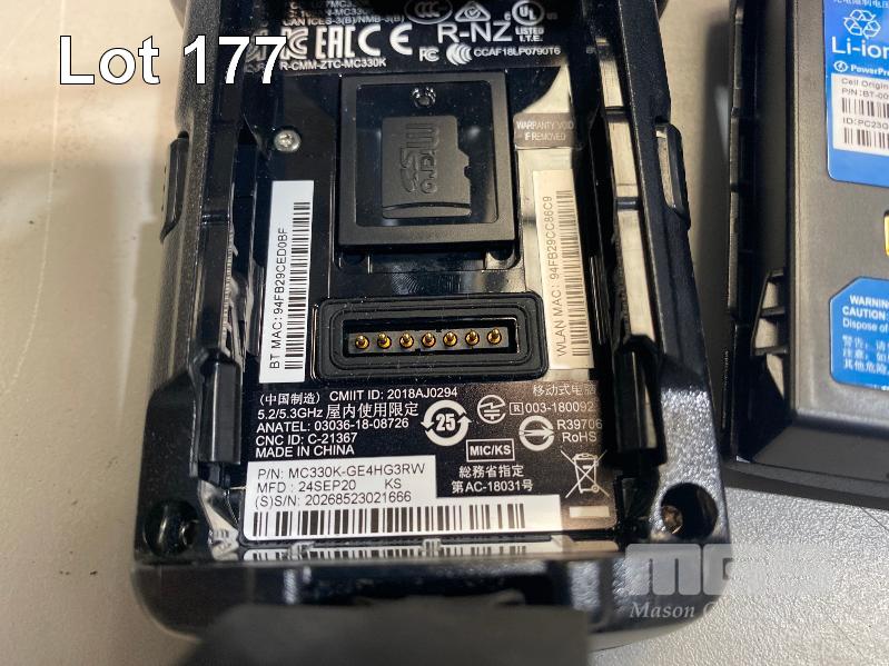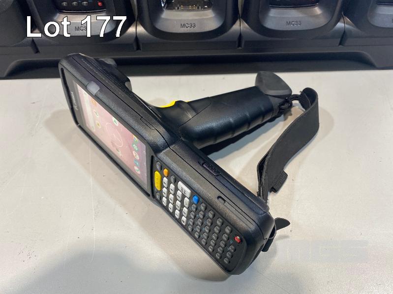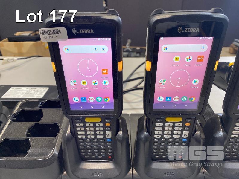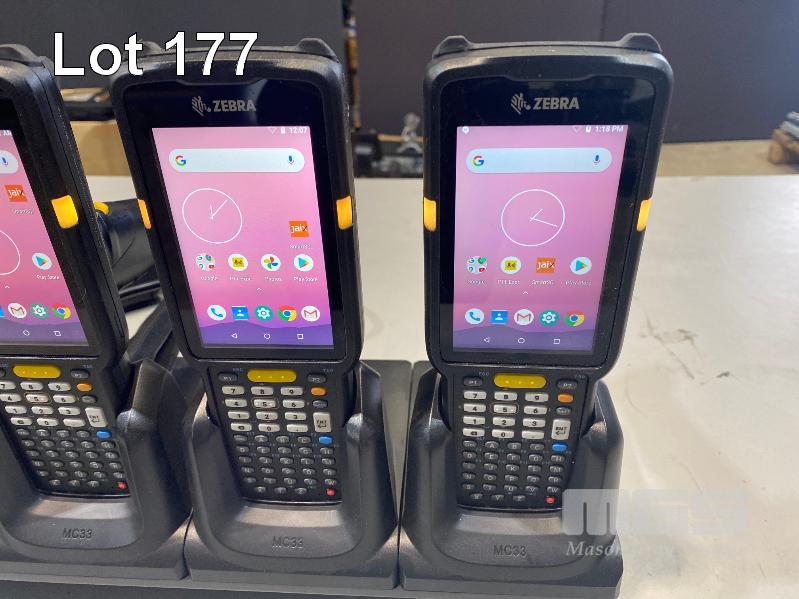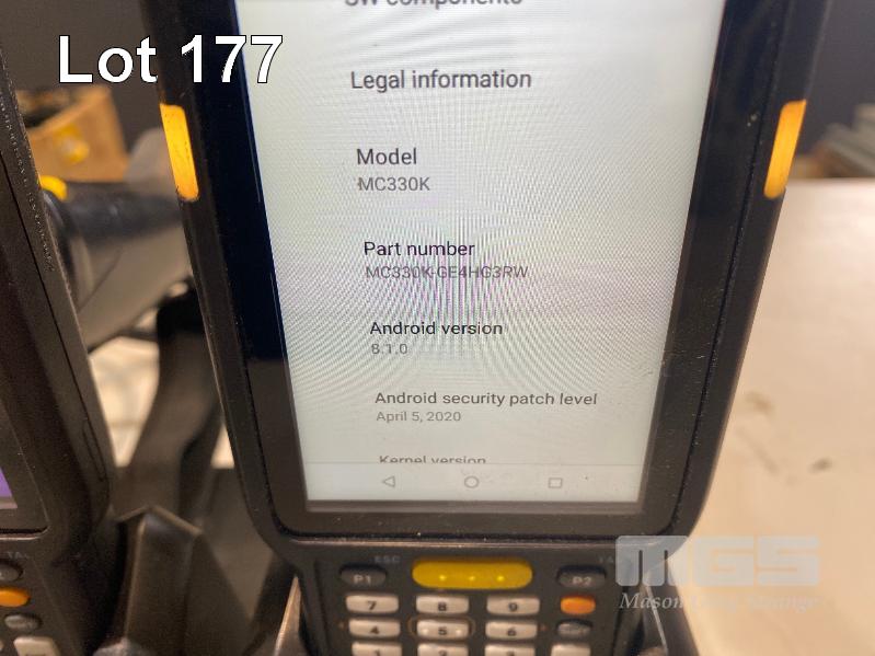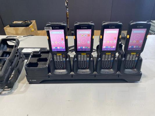 4 x ZEBRA MC330K PREMIUM HANDHELD MOBILE COMPUTERS WITH GUN TRIGGER, ANDROID OS, 2D IMAGER, Wi-Fi, BLUETOOTH, MODEL MC330K-GE4HG3RW (DOM 9/2020) WITH PROTECTIVE RUBBER & ZEBRA CHARGING CRADLE, MODEL CRD-MC33-4SC4BC-01 WITH POWER SUPPLY S/N:S20266523021602, S20268523021666, S20266523021559, S20077523021497