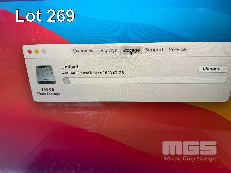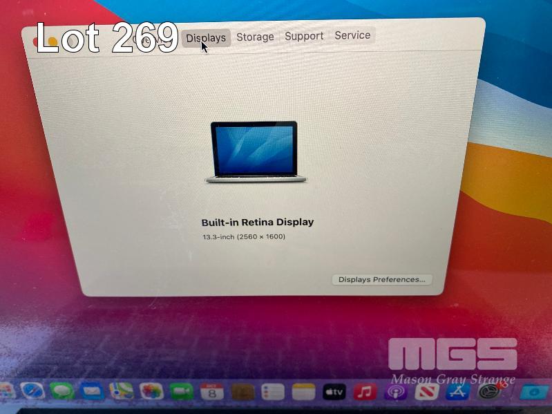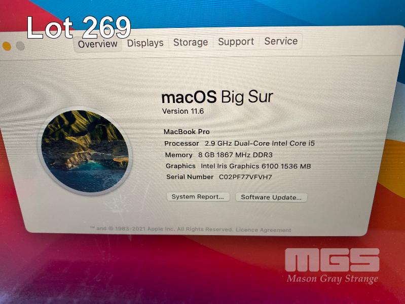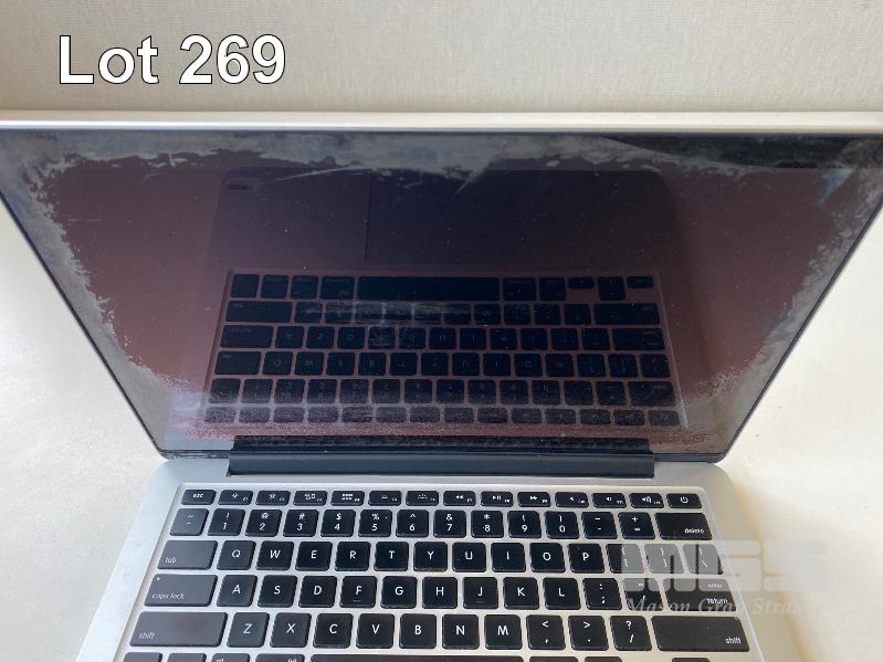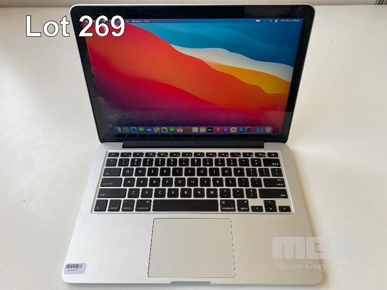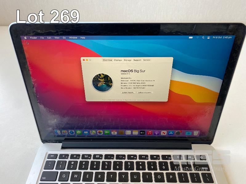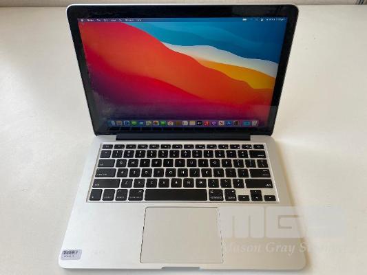 LAPTOP, APPLE MACBOOK PRO (A1502), CORE i5 5287U (5TH GEN) @ 2.9GHz, 8GB DDR3 RAM, 512GB SSD, 13.3" RETINA WIDESCREEN (2560x1600), INTEL IRIS GRAPHICS 6100, Wi-Fi, MAC OS 11.6 INSTALLED & POWER SUPPLY (NOTE: MAJOR MARKS ON SCREEN, MISSING 2 x FEET UNDERNEATH) S/N:C02PF77VFVH7