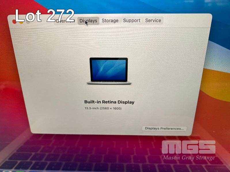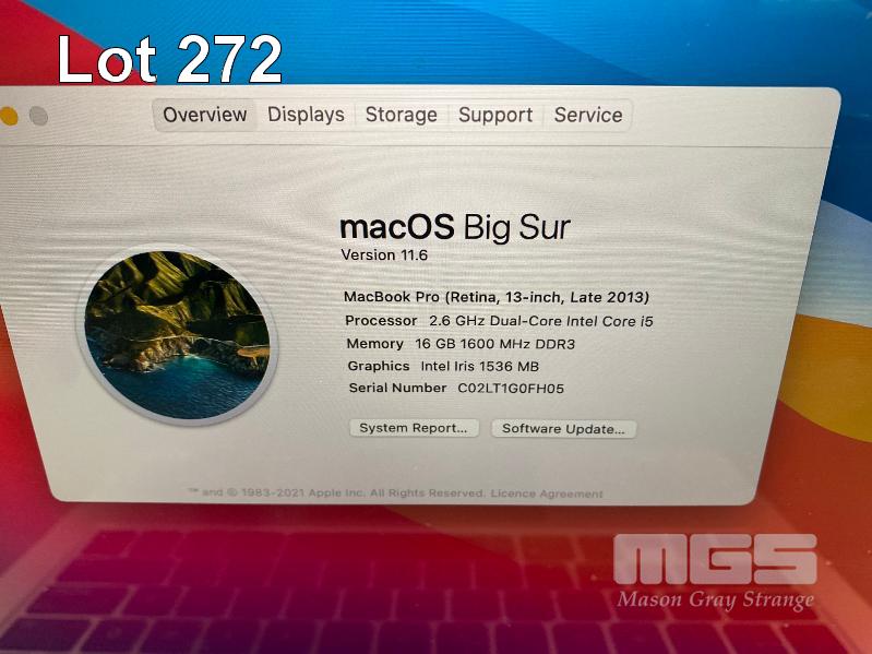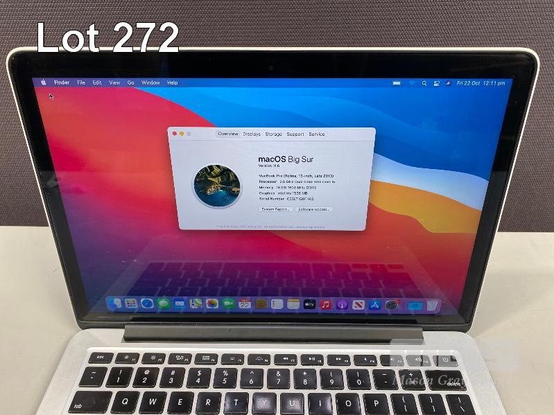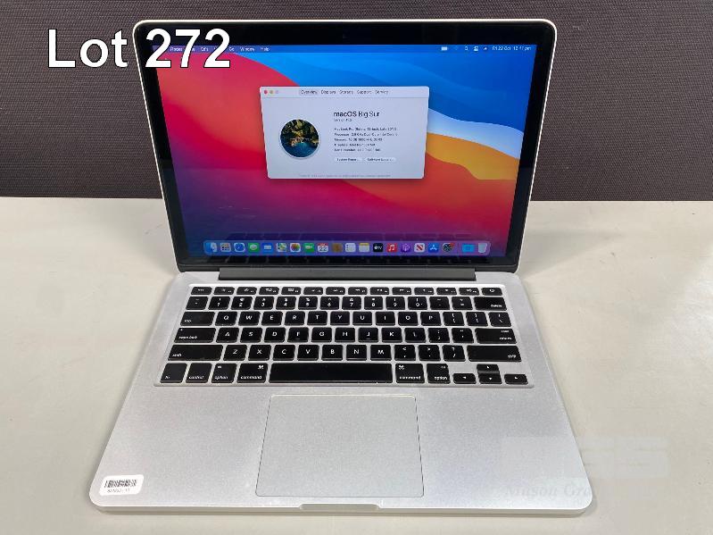 LAPTOP, APPLE MACBOOK PRO (A1502), CORE i5 4288U (4TH GEN) @ 2.6GHz, 16GB DDR3 RAM, 512GB SSD, 13.3" RETINA WIDESCREEN (2560x1600), INTEL IRIS GRAPHICS, Wi-Fi, MAC OS 11.6 INSTALLED (NO POWER SUPPLY) (NOTE: MINOR MARKS & CHIP ON SCREEN) S/N:C02LT1G0FH05