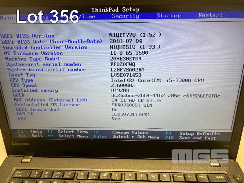 LAPTOP, LENOVO THINKPAD T470 (20HES0ET04), CORE i5 7300U (7TH GEN) @ 2.6GHz, 8GB DDR4 RAM, 256GB NVMe M.2 SSD, 14" WIDESCREEN (1366x768), INTEL HD VIDEO, Wi-Fi, BLUETOOTH, WINDOWS 10 PRO INSTALLED & POWER SUPPLY (NOTE: MESSAGE ON STARTUP "BATTERY NOT SUPPORTED") S/N:PF0Z0FWQ