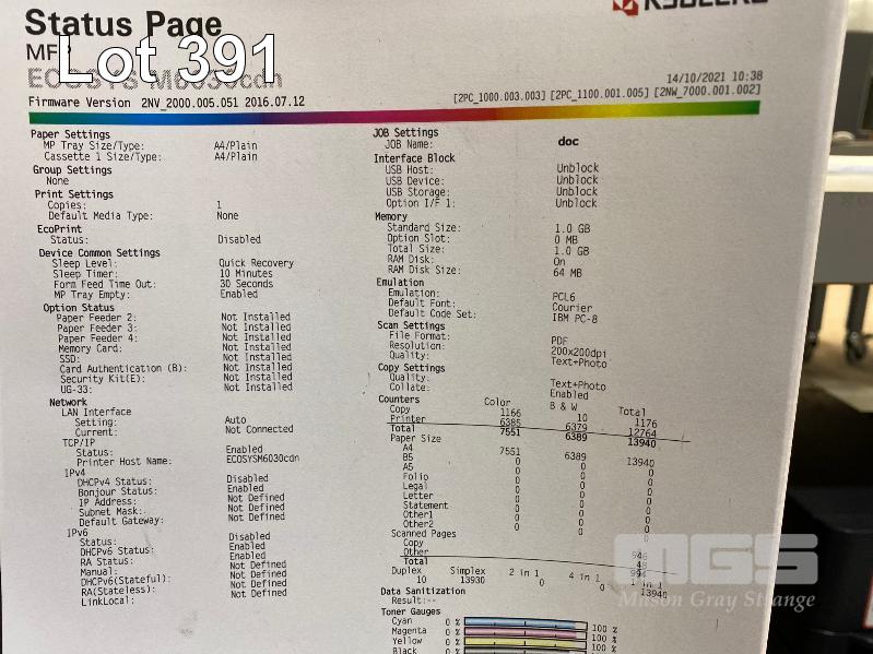 PRINTER, KYOCERA ECOSYS M6030cdn COLOUR LASER MFC, USB, NETWORK, 7,551 COLOUR & 6,389 B&W PAGES (TEST PAGE ATTACHED)