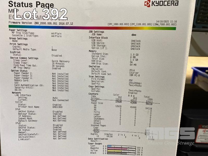PRINTER, KYOCERA ECOSYS M6030cdn COLOUR LASER MFC, USB, NETWORK, 12,628 COLOUR & 41,490 B&W PAGES (TEST PAGE ATTACHED)