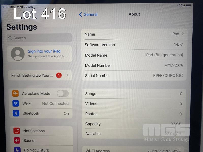 APPLE iPAD (8TH GENERATION), 32GB, Wi-Fi, SPACE GREY, MODEL A2270 WITH USB-C TO LIGHTNING CABLE & USB-C CHARGER S/N:F9FF7CURQ1GC