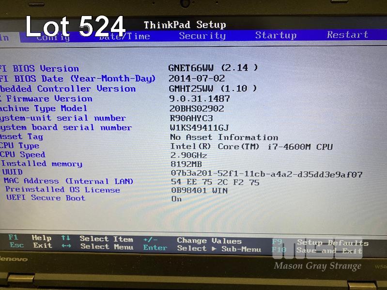 LAPTOP, LENOVO THINKPAD W540 (20BHS02902), CORE i7 4600M (4TH GEN) @ 2.9GHz, 8GB DDR3 RAM, 256GB SSD, DVD-RW, 15.6" WIDESCREEN (1920x1080), INTEL HD VIDEO, 2GB NVIDIA QUADRO K1100M VIDEO, Wi-Fi, BLUETOOTH, WINDOWS 10 PRO INSTALLED, DOCKING STATION & POWER SUPPLY (NOTE: MARKS ON SCREEN) S/N:R90AHYC3