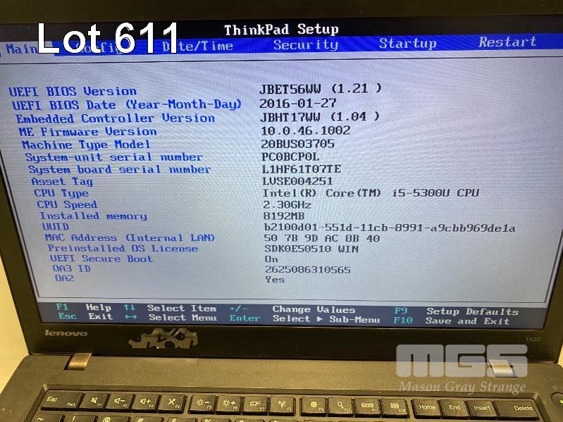 LAPTOP, LENOVO THINKPAD T450 (20BUS03705), CORE i5 5300U (5TH GEN) @ 2.3GHz, 8GB DDR3 RAM, 500GB SATA HDD, 14" WIDESCREEN (1366x768), INTEL HD VIDEO, Wi-Fi, BLUETOOTH, WINDOWS 10 PRO INSTALLED & POWER SUPPLY (NOTE: MARKS ON SCREEN) S/N:PC0BCP0L