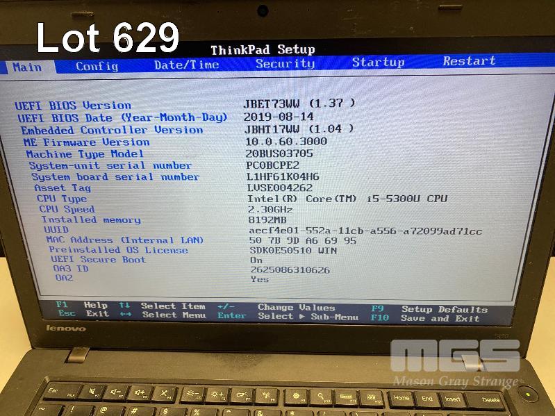 LAPTOP, LENOVO THINKPAD T450 (20BUS03705), CORE i5 5300U (5TH GEN) @ 2.3GHz, 8GB DDR3 RAM, 525GB SSD, 14" WIDESCREEN (1366x768), INTEL HD VIDEO, Wi-Fi, BLUETOOTH, WINDOWS 10 PRO INSTALLED & POWER SUPPLY (NOTE: MARKS ON SCREEN, WHITE SPOT SCREEN BLEMISHES) S/N:PC0BCPE2